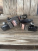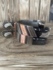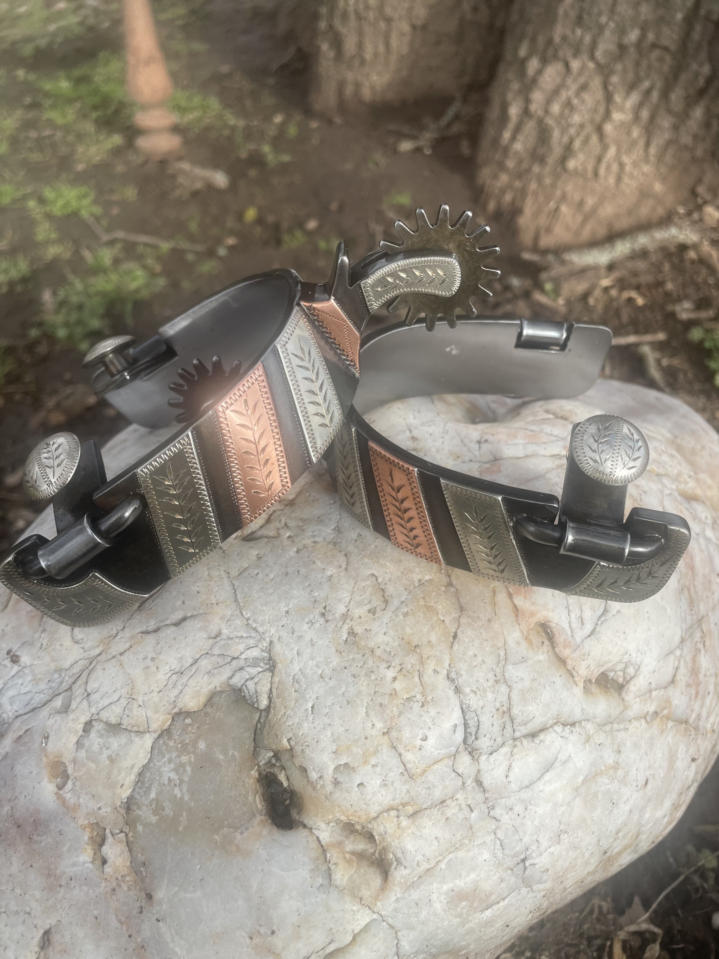 Handmade short shank spurs by Ray Castleberry of Madill, OK. I am the maker. Marked RC. These spurs have nickel silver and copper bars. Boot openings are 3 1/4”, heel bands are 1 1/16”, shanks are 1 3/8”, and the rowels are 1 1/8” rock grinder. Call or text.