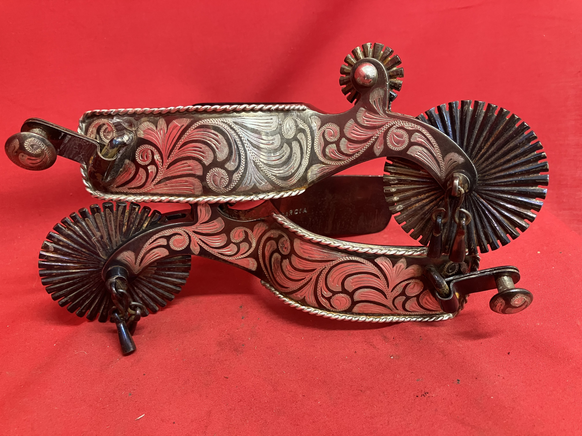 E GARCIA marked spurs in unused condition with 1 1/2" bands, 2 1/2" rowels, 3" shanks, 3" heel openings. Made in the Tom Mix style with the rowels in the chap guards. Beautiful pair!! We pay shipping within the 48 states. We accept most forms of payment.