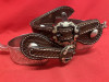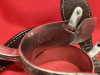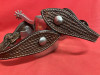 FLEMING marked spurs in good condition with 1 1/2" bands, 3 1/8" heel openings, 1 1/8" rowels, 2" shanks. Come with straps that have unmarked mounted buckles. Shanks are turned in. Previous owners initials scratched on the inside of one swinger on each spur. We pay shipping within the 48 states. We accept most forms of payment.