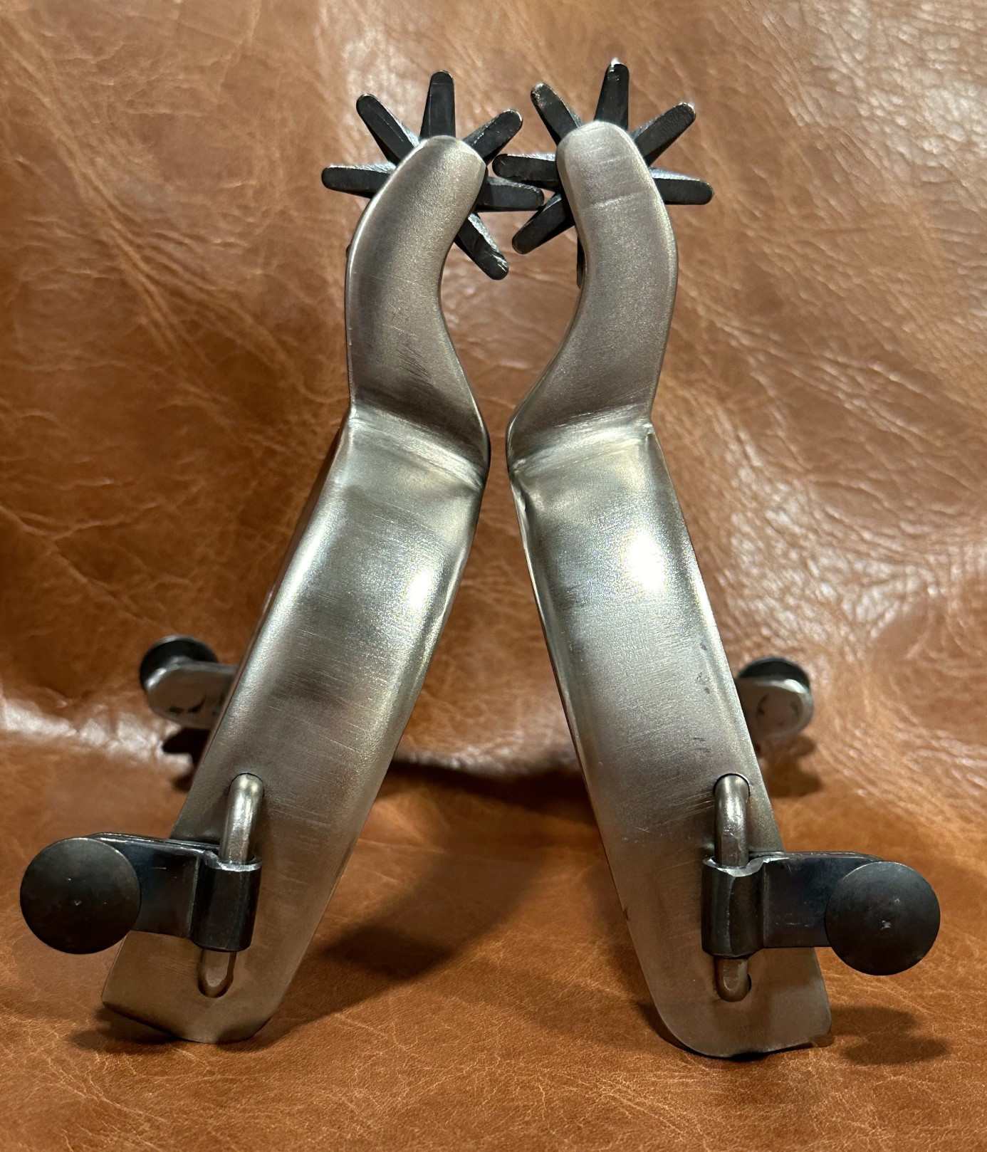 New Stainless steel spurs ready for Spring work. I built this set from 304 stainless on the bands and shanks to hold up to some tough use. Rowels and button hangers are 1018 steel which I left blue from the welding heat. Bands are 1", Shanks are 1-3/4", and Rowels are 1-1/2" 8 point, Heel opening is 3-3/8" Thanks for looking