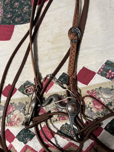 David Hunt fully rigged on Lindsey Kelly lined and tooled split ear w Lagunas buckle. Buttersoft 8’ reins w weighted ends. Good curb. All in new condition and ready to hang on ur hoss. $625 shipped lower 48. Please text or call only. Thank you