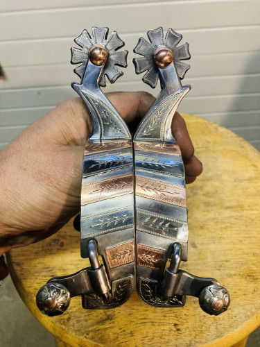Really nice pair of handmade men’s custom spurs. 1 1/8" bands, 2" shanks, 3 1/4" heel openings. The bands are tapered for better fit and feel.