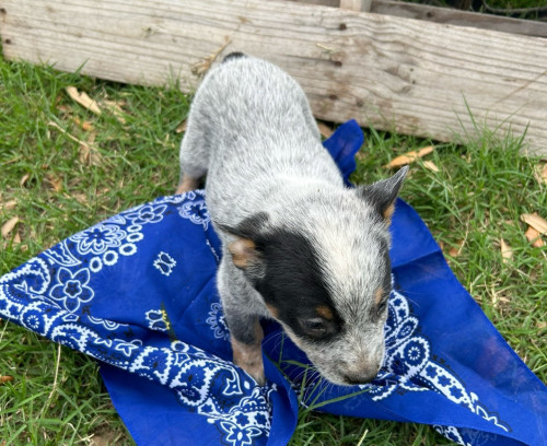 Blue healer pups born Jan 14, mom and dad are both working dogs and on site. Pups have been given 1st and 2nd shots and dewormed twice.
