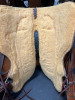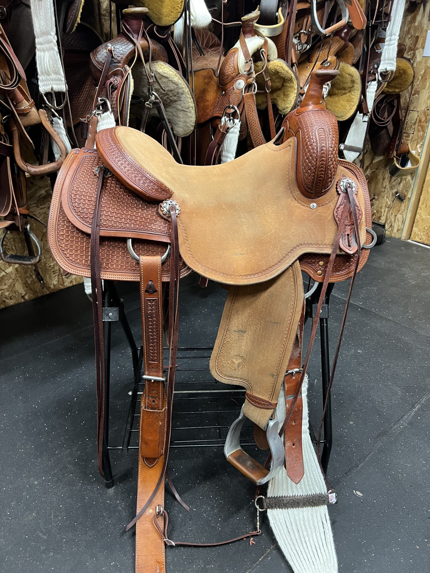 This saddle features a 16” rough-out hard seat, 7” gullet, FQH bars, fiberglass coated wood tree, 13” swells, 3” cantle, 7/8 in-skirt rigging, breast collar dee rings, 6 long leather ties, new off billet, new front cinch, fleece is good, and weight is around 35lbs.