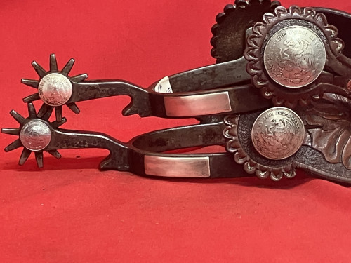 ROGERS 1998 1055 spurs by the late Don Rogers from Hereford, Tx. Unused condition with good straps, 8 Mexican coins, made in the Bianchi style. 2 5/16" shanks, 1 1/2" rowels. Nice pair to use or to add to a collection. We pay shipping within the 48 states and accept most forms of payment.