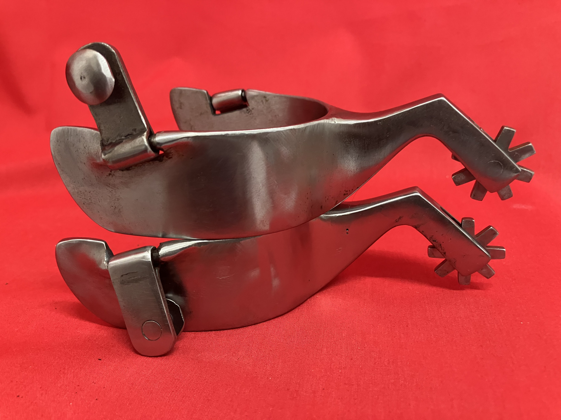 DAN 2024 spurs made in the style of EF Blanchard’s #5 style. Unused condition. 1 7/16" bands, 3 1/4" heel openings, 2 1/2" shanks, 1 1/8" rowels. Very well done by the Texas maker. We pay shipping within the 48 states. We accept most forms of payment.