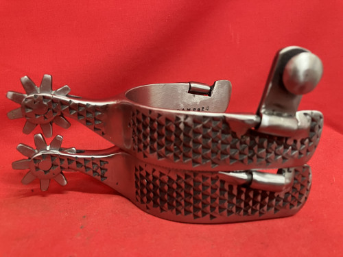 DAN 2024 marked spurs in unworn condition with 1" bands, 3 7/16" heel openings, 1 3/4" shanks, and 1 1/4" rowels. Very quality made pair by the NE Texas maker Dan Wisely. We pay shipping within the 48 states. We accept most forms of payment.
