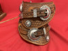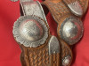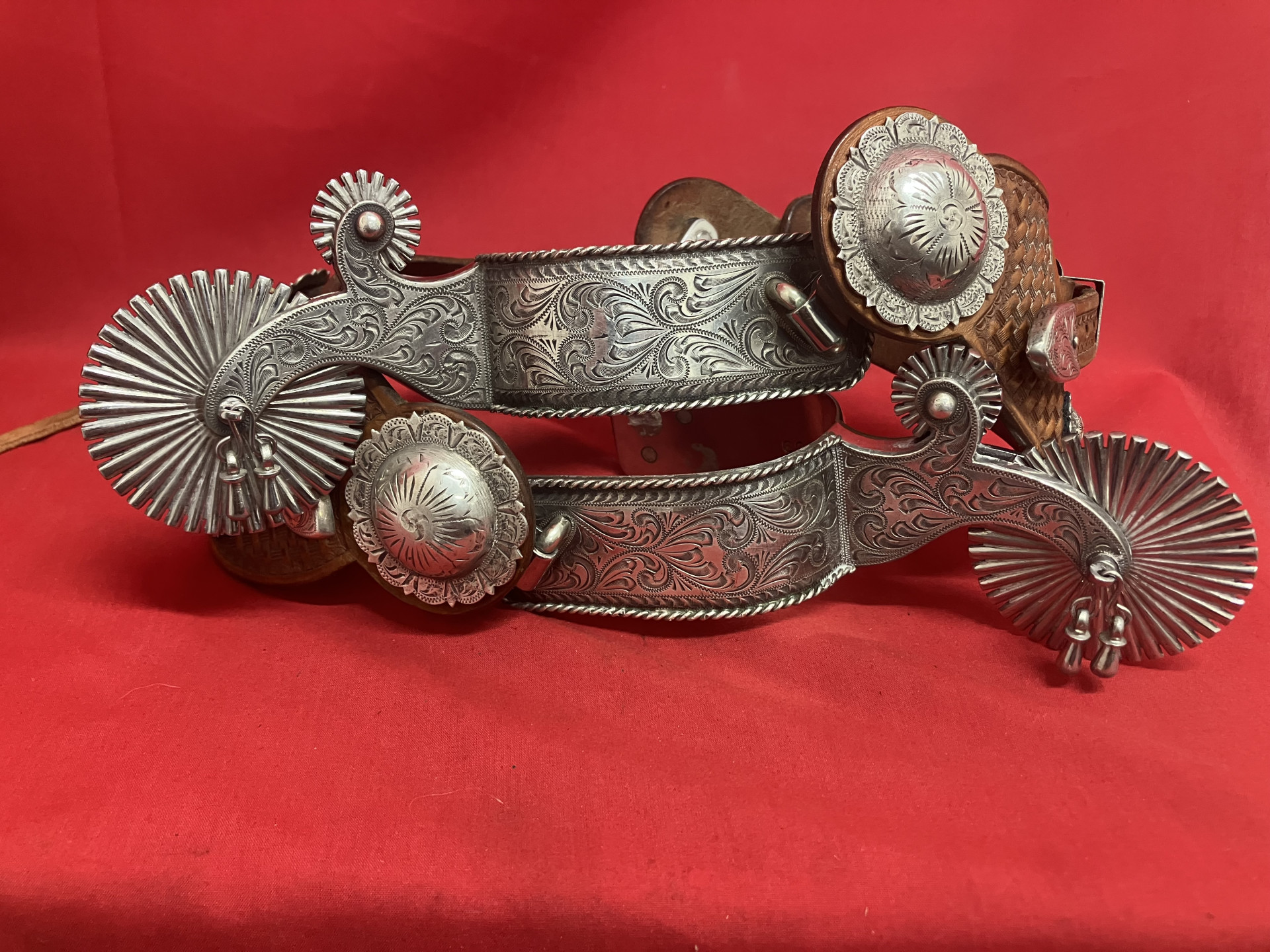 E GARCIA spurs with outstanding maker marked straps. Straps are from a shop in Winnemucca Nevada and are maker marked. Buckles are marked sterling overlaid. Could not see the back of the 2" conchos but they look sterling or at the least sterling overlaid. The spurs are in like new condition and feature 2 1/2" rowels, 3" shanks, 1 9/16" bands, 3" heel openings. great combination of spurs and straps. We pay shipping within the 48 states. We accept most forms of payment.