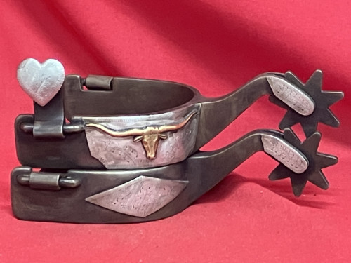 Unworn spurs by the late Don Pierce of Colorado. Feature 1 1/16" bands, 3" heel openings that can be spread, 2 3/8" shanks, 1 1/2" rowels. Silver mountings on both side with brass overlaid steer heads. We pay shipping within the 48 states and accept most forms of payment.