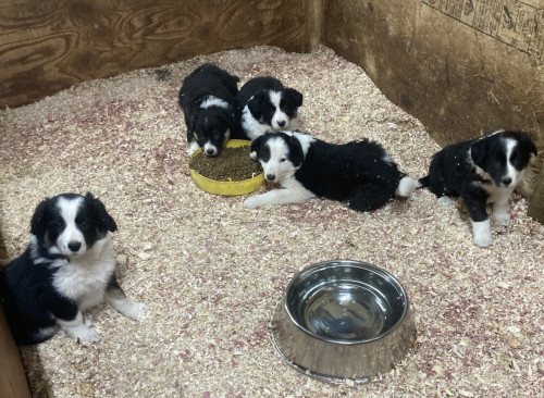 5 border collie puppies with great working potential as both parents are working dogs. Up to date on shots and wormer. They are ready to go now! Pick yours out of 3 males and 2 females.