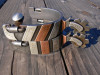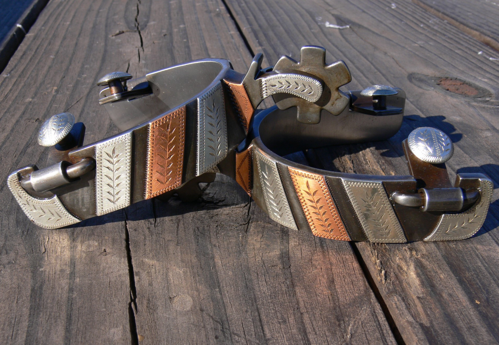 Handmade Double Mounted Roping Spurs by Ray Castleberry of Madill, OK. Marked RC. Slanted copper and nickel silver bars on the outside, and straight bars on the inside. Boot openings are 3 1/4", heel bands are 1", shanks are 1 1/2" and the rowels are 1 1/4" 6 point. Well built spurs. Call or text.