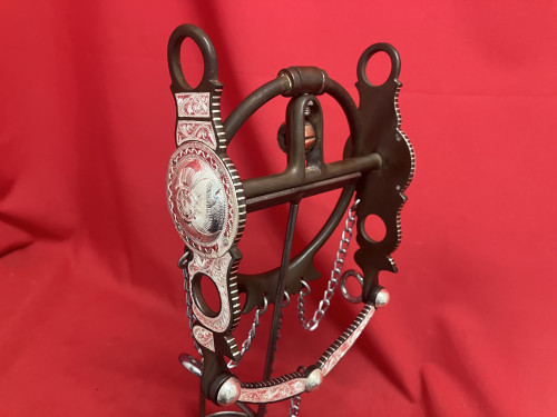 CHARLIES’S ring bit in unused condtion with ring that can be removed. 6 3/8" cheeks. 5 3/16" mouth. This bit was patterned after 100+ year style bit. Copper in the back of the mouth. Made with pure silver. We pay shipping within the 48 states We accept most forms of payment.