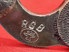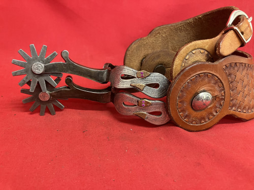 Sale Pending-----Rick Brightwell double mounted spurs in unused condition with straps. His maker mark is shown in the pictures. He is featured in the Martin’s book on modern makers. 3 1/4" heel openings, 1 5/8" rowels, 2 1/2" shanks. Collectible pair. I seldom see any of his spurs for sale. He was an Arkansas maker. It is my understanding that they are one piece forged spurs. We pay shipping within the 48 states and accept most forms of payment.