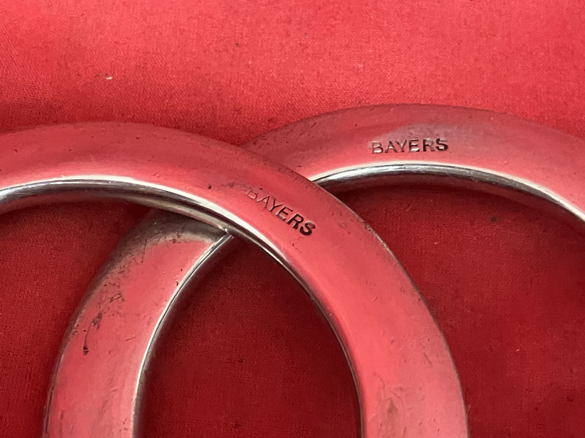 BAYERS marked girth rings by Adolph Bayers. Rings in good condition. They are on a Calvin Allen 28.5" girth. The girth is in not so good condition, so I am saying that you are buying only rings. These are getting harder and harder to find. We pays shipping within the 48 states. We accept most forms of payment.