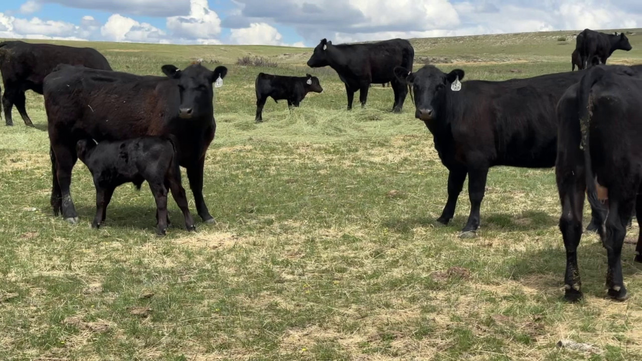 A 1 iron, home raised set of 2 yr olds that have a sweet set of late March/April born calves at side that are sired by Skinner Angus blk bulls, calves are all tagged to match mothers, bull calves have been banded, no shots given nor any brands, these babies are ready for your program. Heifers got some depth and length to them and are super gentle, easy handling type.