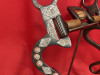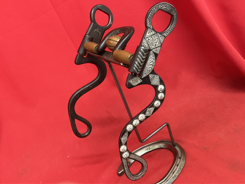 Well done silver inlaid bit with 7 7/8" cheeks and 4 3/4" mouth from LES VOGT’S FLAT CREEK and so marked and numbered. In what appears to be unused condition. Loose cheeks. Previous owners brand inscribed in the inside of a cheek. We p[ay shipping within the 48 states and acceopt most forms of payment.