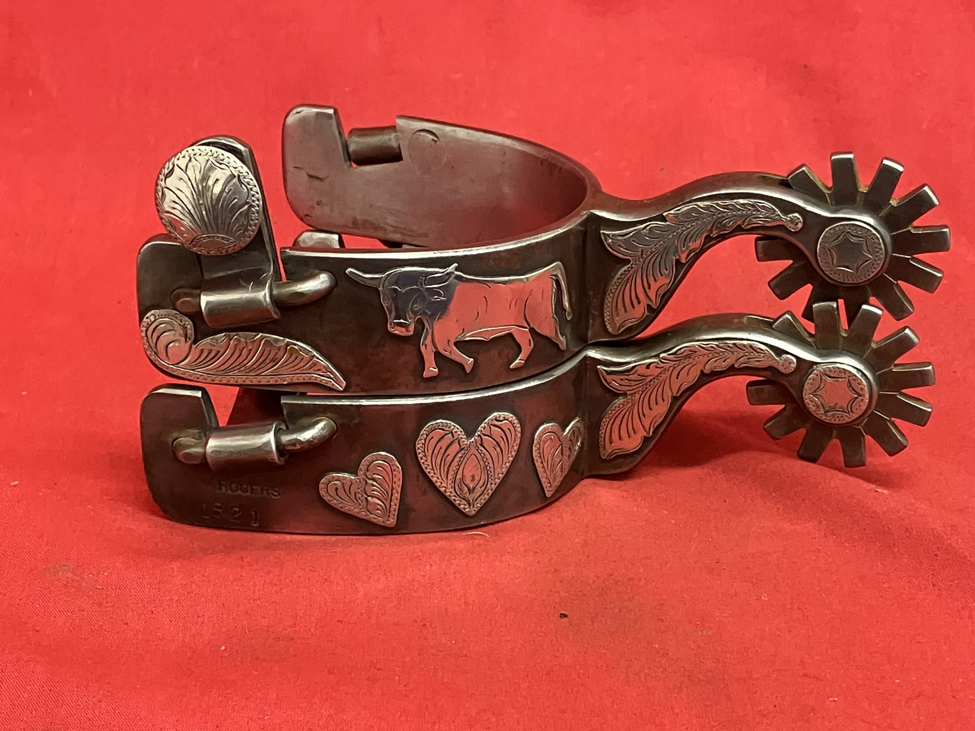 Like new pair by the late Don Rogers of Hereford, Tx. 1 3/16" bands, 1 1/2" rowels, 3 1/4" heel openings, 2 3/8" shanks. He really did nice work making quality cowboy Tools. Marked ROGERS 1821. We pay shipping within the 48 states and accept most forms of payment.