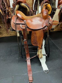 This saddle features a 17" padded suede seat, 3 1/2" cantle, 6 long leather ties, post horn, stainless steel dee rigging, 6 1/2" gullet, Standard Quarter horse bars, rawhide wrapped wood tree, new latigo, new front cinch, new back cinch, fleece is good, and weight is around 40lbs.