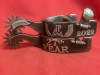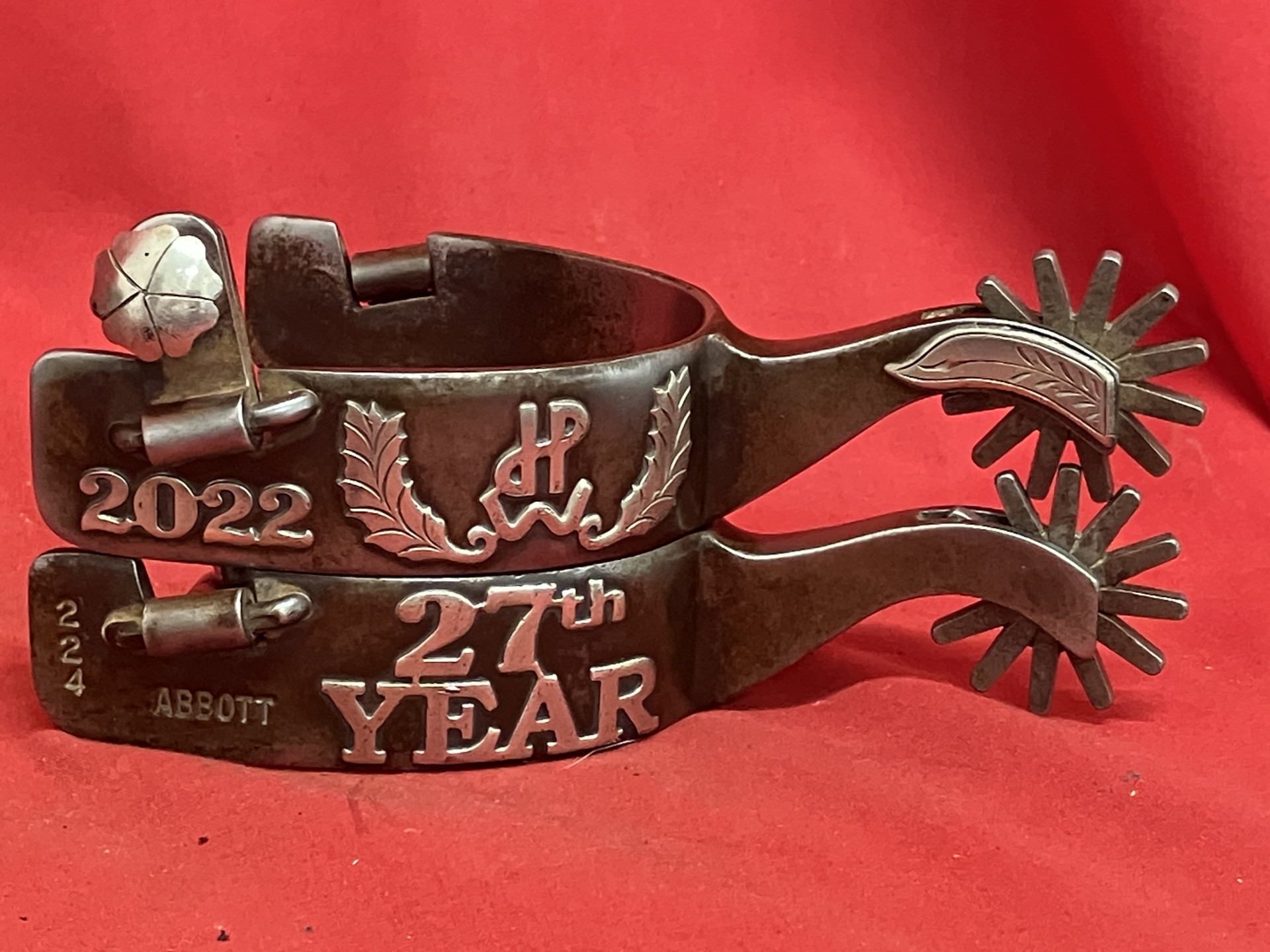 Sale Pending---Larry Abbott 224 marked spurs by the popular maker from Texas. Made in 2022 for the 27th annual Wild Horse Prairie days at Haskell, Tx. Outside letters show some use, but the rowels are good showing limited wear. 1 1/8" bands, 3 3/8" heel openings, 2 1/4" shanks, 1 1/2" rowels. Do not see much of his work on the market. We pay shipping within the 48 states. We accept most forms of payment.