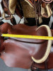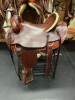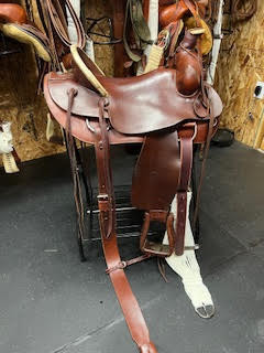 This saddle features a 17" hard seat, 4 1/2" cantle, post horn with leather dally wrap, rope strap, round skirt, breast collar dee rings, 6 long leather ties, 7" gullet, FQH bars, Rawhide wrapped wood association tree, Stainless steel rigging, back cinch, new front cinch, new latigo, new half breed off billet, fleece is like new, and weight is around 40lbs.