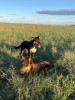 Puppy from working parents. Sire is an Australian Kelpie, bitch is a Border Collie. There are videos of both parents working available upon request. Both parents are great working dogs, great family dogs, and are also able to be left out on the ranch without causing trouble. She has a lot of eye and good drive. She is 7 months old and ready to start training. UTD on standard shots.