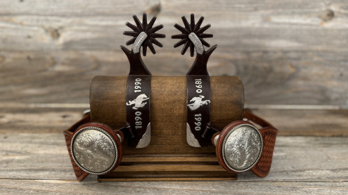 Built by the popular maker Randy Butters of Homer, Michigan, in 1990 to celebrate the 100th Birthday of the State of Wyoming, these are a very nice pair spurs. These are stamped " Old West Antiques, Cody, Wyoming, R. Butters, 3 of 10." They feature swinging silver engraved buttons with the famous state bucking horse in between "1890 & 1990", as well as silver overlay on the rowel guards and the end of the heel band. Two-piece leathers adorned with 2 1/2" silver engraved conchos. Conchos are marked "Wage German Silver" on the inside. Leather straps are stamped "Krause Saddle Co., Cheyenne, Wyo." Rowel Diameter: 2 1/8", Number of points on Rowel: 12, Heel band opening: 3 3/8”, Overall length: 6 1/2". Price includes shipping via FedEx ground/insured w/ signature confirmation to the CONUS.