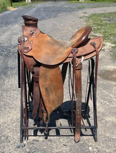 Freckers wade saddle made by Porter Rix. Saddle #1711. 15" seat size. 4x90 Freckers tree size. 19" length fenders. 5" horn cap.