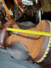 This saddle features a 14" padded suede seat, 4" cantle with silver laced rawhide, single short skirt, 7/8 in-skirt rigging, post horn, dee rings on the back conchos for leather ties if wanted, fleece is in good shape, 6 1/2" gullet, QH bars, and weight is around 30lbs.