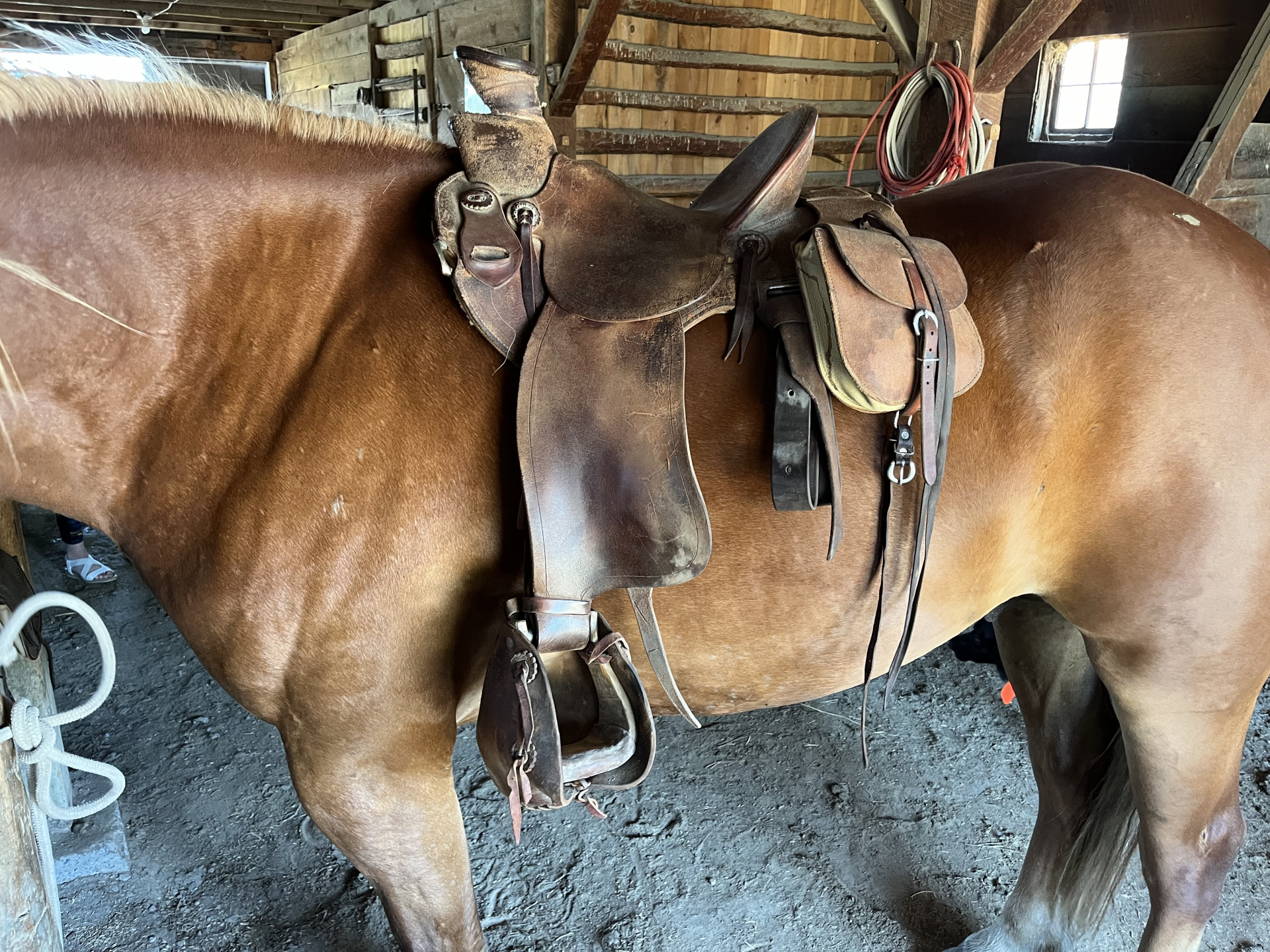 Duncan Vezain saddle only 3 years old! It is a 14inch with a 5/8 riggin. Comes with an older Polly rope, new mule hide, two cinches and the back cinch, breast collar, bull nose taps, saddle bags, and saddle pad All for only $4000. The bad is it has a little wear on the horn for burring rope wile pulling a cow out but still slides rope well if you wrap your mule hid on thick. You probably won’t find a better set up for this cheap it all come ready for cowboying.