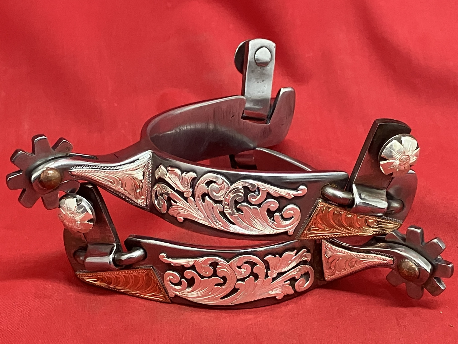 sale pending------------TITTOR spurs by Texas maker Mickael Tittor. In unused condition, mounted with sterling and copper.