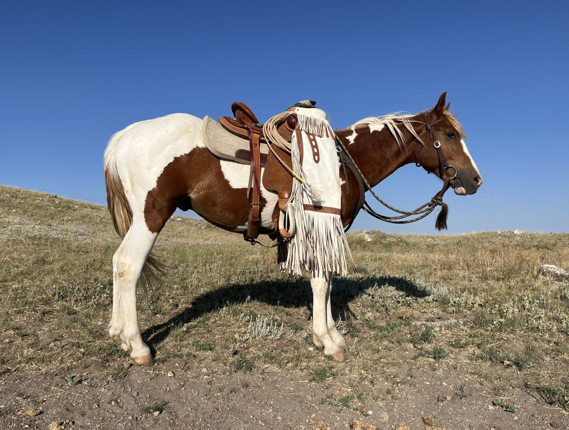 Romel is an eye catcher for sure. He has a little over 30 days on him. Has been ridden out, in the mountains, wide open fields. Stands tied, trims, loads, crosses water great! Has drug logs. He has a ton of potential and will be awesome in whatever you decide to take him and do. He stands around 14.2 hands right now, has some draft in him so will grow lots more. Take this colt and drag calves in the spring! He’s got a great start and ready to go do some jobs! The video done on him was when he only had between 8 and 12 rides on him.