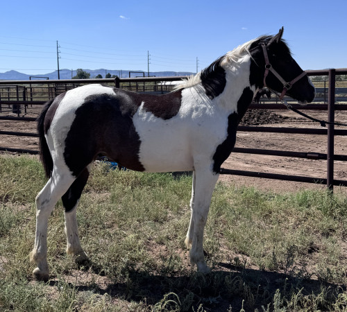 2024 paint half percheron and quarter horse gelding, halter-started. Raised outside on a rough country, West Texas ranch.