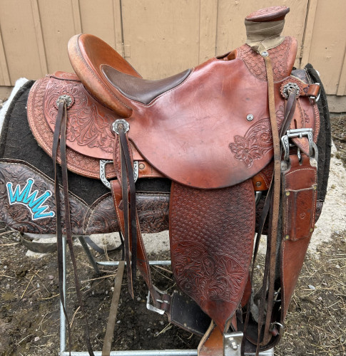 Custom made wade saddle by Mark Channer on a Rick Reed tree. Jeremiah Watt hardware, mule hide horn wrap. Our whole family rides in Marks saddles and we love every one of them. Fits everything it’s been on. 4” wide and 3” tall horn. 15.5” seat.