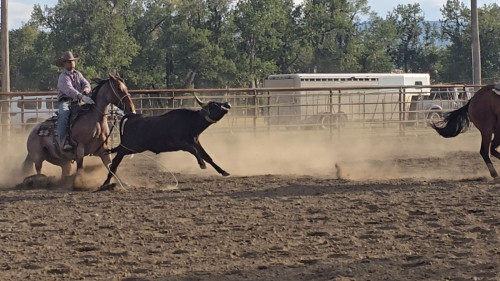 Oakie is a flashy red roan gelding that is about 15 hh. He always gives 100% effort whether he is out on the ranch or in the arena. He is a horse that is sure footed, cowy, and super athletic. Oakie is really broke, moves around in a graceful efficient manner, and just soft all the way around. He has done all aspects of ranch work and covered a lot of ground. Oakie has become an exceptional heal horse and been to lots of jackpots. If you need a horse that can work a cow, has a nice turnaround with a big stop check out Oakie. I can’t say enough good things about this horse. He truly is one of the good ones.