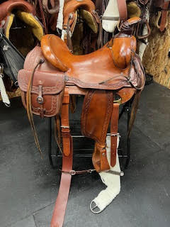 This saddle features a 15.5" hard seat, 6 1/4" gullet, SQH bars, rawhide wrapped association wood tree, 4" cantle, post horn with leather dally wrap, rope strap, 7/8 drop rigging, breast collar dee rings, twisted stirrups, new back billets and back cinch, new off billet, new latigo, and new front cinch.