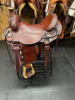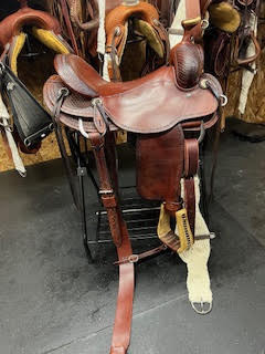 This saddle features a 17" hard seat, 4" cantle, stainless steel rigging, round skirt, 6 long leather ties, 6 1/2" gullet, FQH bars, famous Martin Axis tree, 6 long leather ties, fleece is great, post horn, breast collar dee rings, rawhide wrapped stirrups, new half-breed off billet, new latigo, new front cinch, and weight is around 40 pounds.