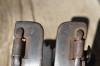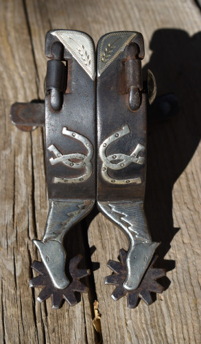 Nice, well made pair of horsehead shank spurs marked PRC (Pat Ray Castleberry). Single mount. Bands measure just under 1" wide, the shanks are 1 3/4" long with 10-pt rowels that measure 1 1/4" across; heel openings are approx. 3" wide. Show some wear on the swingers but still have a lot of life left; rowels are tight.