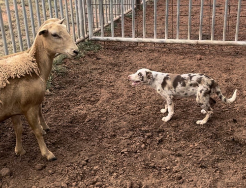 6 month old male Border Collie pup. Hooked up on stock real good.