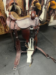 This saddle features a 17" leather padded seat, post horn, 4" cantle, single round skirt, 6 long leather ties, breast collar dee rings with matching breast collar, 7/8 in-skirt rigging, 6 1/2" gullet, FQH bars, Martins famous axis tree, angled stirrups, fleece is good, and weight is around 34lbs.