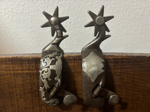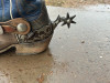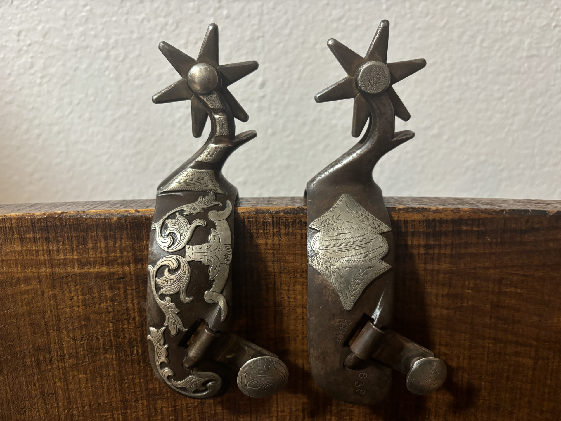 Pair of Clint’s handmade 6 point rowel spurs. #838, 1-7/8, 2” shank, 1-3/8 band