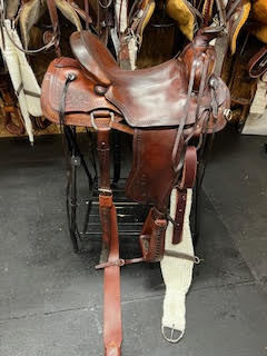 This saddle features a 16" hard seat, 6 3/4" gullet, FQH bars, rawhide wrapped wood tree, post horn with a long leather rope strap, breast collar dee rings, 4 1/2" cantle, 4 long leather ties, stainless rigging, pre-twisted stirrups, fleece is good, back cinch, new half-breed off billet, new latigo, new front cinch, and weight is around 40lbs.