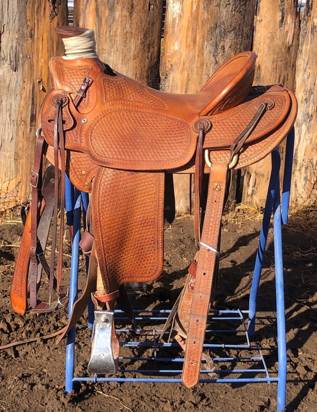 Good used Wade saddle in excellent shape. It fits horses good and we have roped on it quite a bit and never had a problem. 15 1/2 in seat.