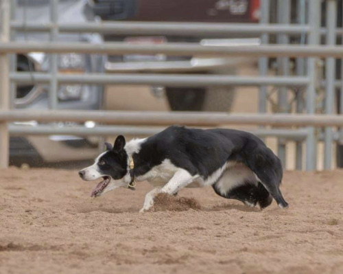 Zoey is a classic black and white slick coated three-year-old intact female that has been used around the Ranch extensively working pairs, bulls, and yearlings as well as working training sheep at home.
