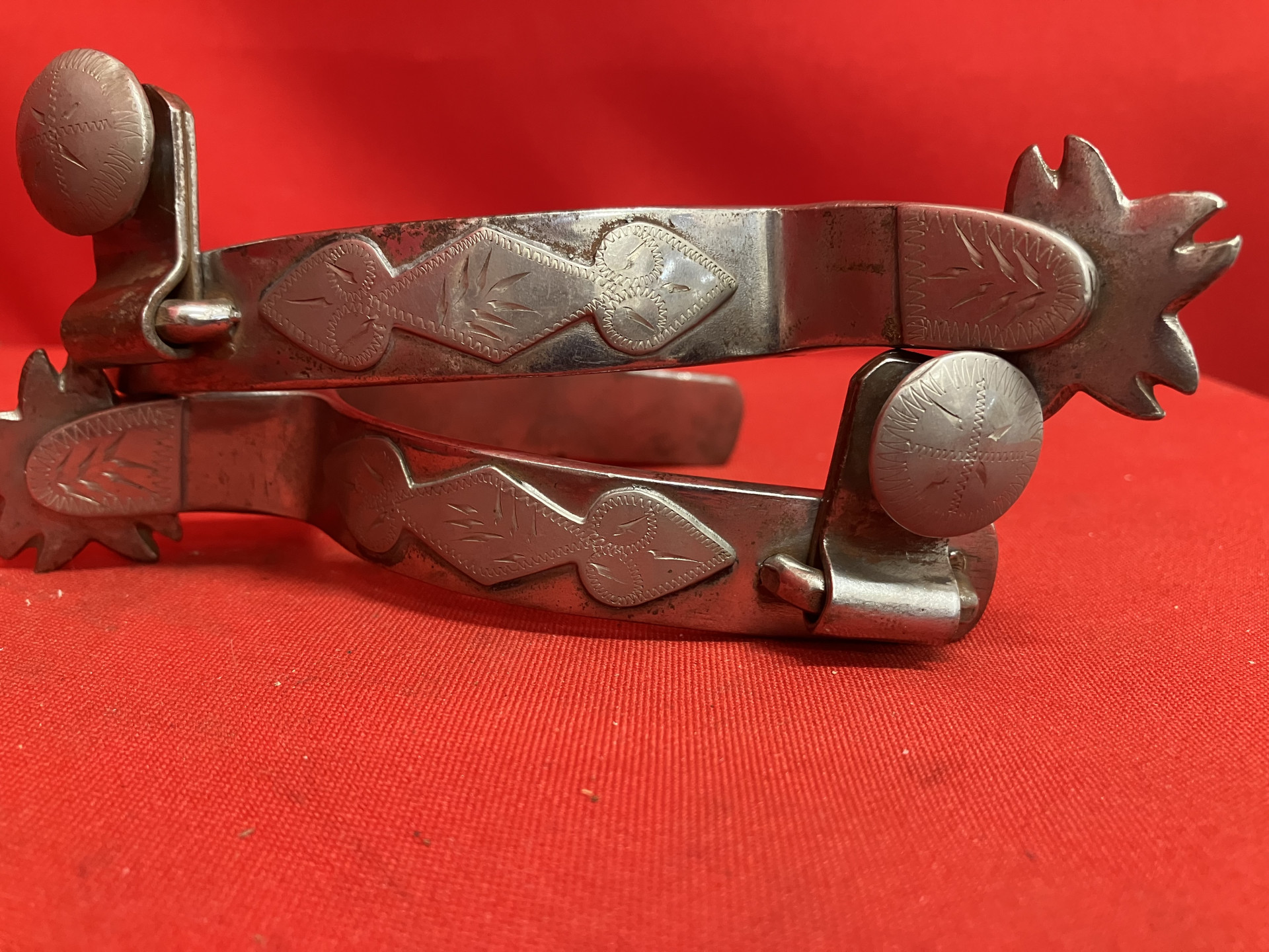 CROCKETT marked spurs in what appears to be unused condition. They are cold steel not stainless. 1 1/2" shanks, 1 1/4" rowels, 3 1/4" heel openings, 3/4" mounted bands. Nice pair to use. From a large Texas collection. We pay shipping within the 48 states. We accept most forms of payment.