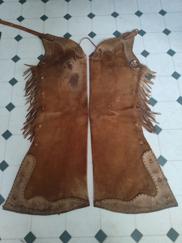 Nice pair or ranch made leggins. Broke in but they have a lot of life left in them. The measurements are: