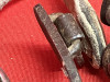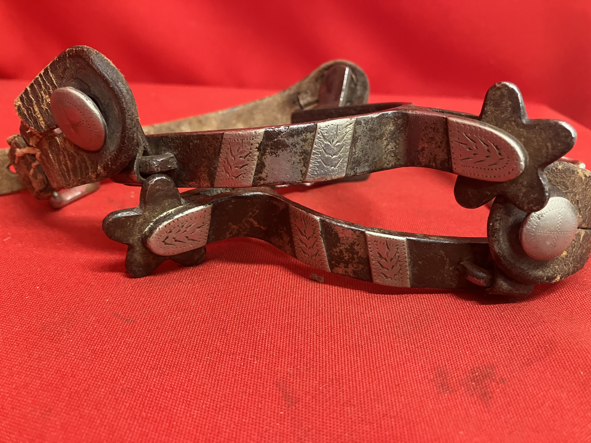Vintage CROCKETT marked spurs with 1 1/2" shanks, 1 1/4" rowels, 5/8" bands, 3 1/8" heel openings. Edge marked. Mountings tight and original. One rowel point has a rough spot. Spurs in good using condition. The straps are not usable. We pay shipping within the 48 states. We accept most forms of payment