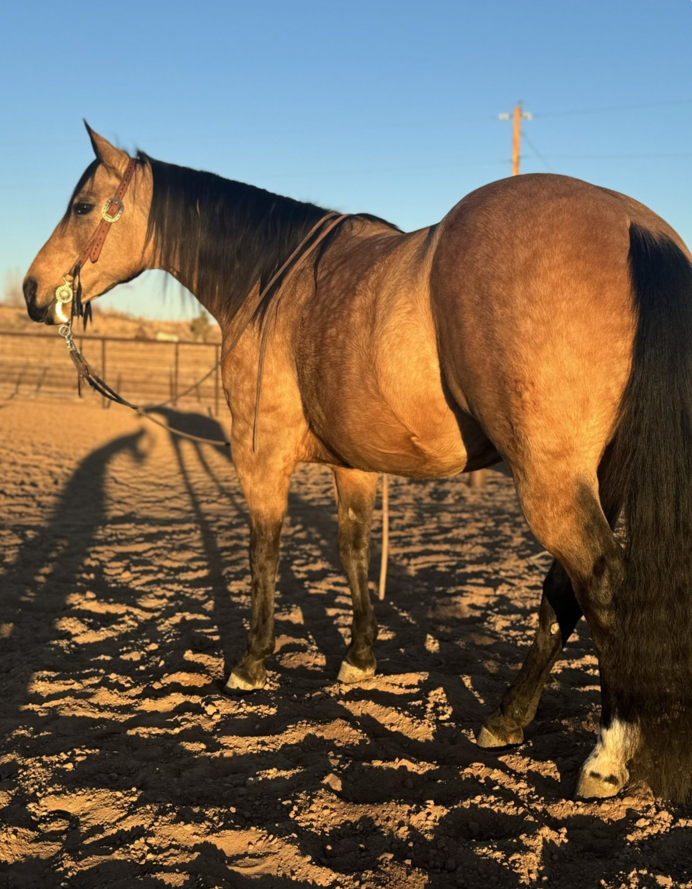 Lady May is a 2018 model beautiful dapple buckskin AQHA mare that we have raised and had the pleasure of training and riding the last couple of years. She stands 14.3 and about 1250 with perfect confirmation and as pretty as they get! Her papers alone are outstanding stacked with some outstanding bloodlines, and she ties up the whole package. Her ground manners are immaculate, clips, loads and backs out of the trailer, stands tied all day, even if she’s alone. She is UTD on everything, has always been a very easy keeper, she does do best with front shoes when out and about in the rocks because of being thin soled. She is finished on the head side, warms up in the arena nicely and stands quietly in the box, scores like a rock. We have dabbled a little bit with her on the heel side, breakaway and barrels, it would not take much to get her finished. Lady May also has been extensively used all over the ranch, she is as handy as they get! Been there done that kind of mare and doesn’t question anything you ask her to do and is patient all day long. She has spent countless hours branding and pushing cows, even when things get a little ranchy, she will still keep her cool and looks pretty doing it. Loves to trail ride, go out alone with no questions asked, and she’ll go all day quietly. She can be ridden by kids or beginners, but saying that, she still is a performance horse and likes to do her job and will step up when asked. She is the kind of horse that if something goes wrong or she does something wrong, it’s your fault. She is one of the sweetest mares you’ll ever meet, not marish at all even out in the pasture. When turned out she minds her own business, and in a stall she is quiet. Eats and drinks well on the road as well. We are sad to see this one go, but we plan to grow our program, and we truly believe she will make someone really happy! I will hold her for a week for free after the sale, can help arrange shipping, and will haul up 150 miles free of charge.