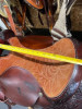 This saddle features a 15.5" padded suede seat, 6 1/2” gullet, Standard Quarter Horse bars, rawhide wrapped wood tree, 4” cantle with rawhide trim, dee rings on back conchos for leather ties if wanted, stainless rigging, new back cinch, new latigo, new front cinch, 13”swells, post horn with leather dally wrap, fleece is in great shape, and weight is around 36 pounds.
