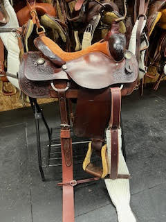 What a saddle! This is a beautiful Circle Y. This is a saddle to spend long days in working cattle, pack trips, or breaking colts. Dandy saddle that will get the job done. Saddle is in fantastic shape and made to last.
