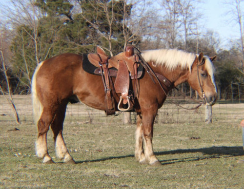 Hank will stand 14.2 and be as wide as he is tall he will be one hand broke and handy to ride around we have been using him in the stockyards yarding cattle back we have drug calves on him if you hook it to him he will pull it he has a nice short lope and a big stop he will also work single or double he is sound in every way and an easy keeper.